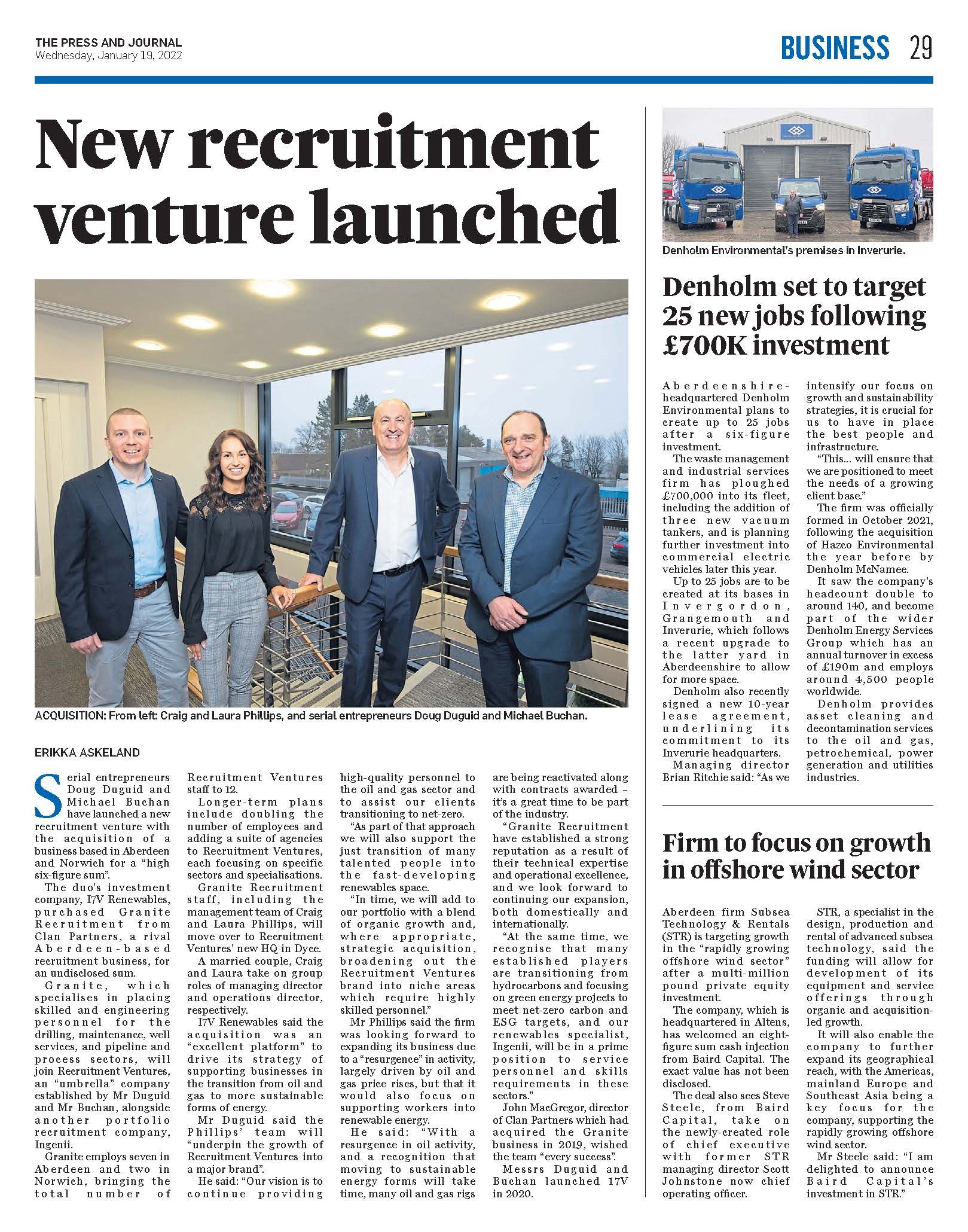Granite, which specialises in placing skilled and engineering personnel for the drilling, maintenance, well services, and pipeline and process sectors, will join Recruitment Ventures, an “umbrella” company established by Duguid and Buchan, alongside another portfolio recruitment company, Ingenii.