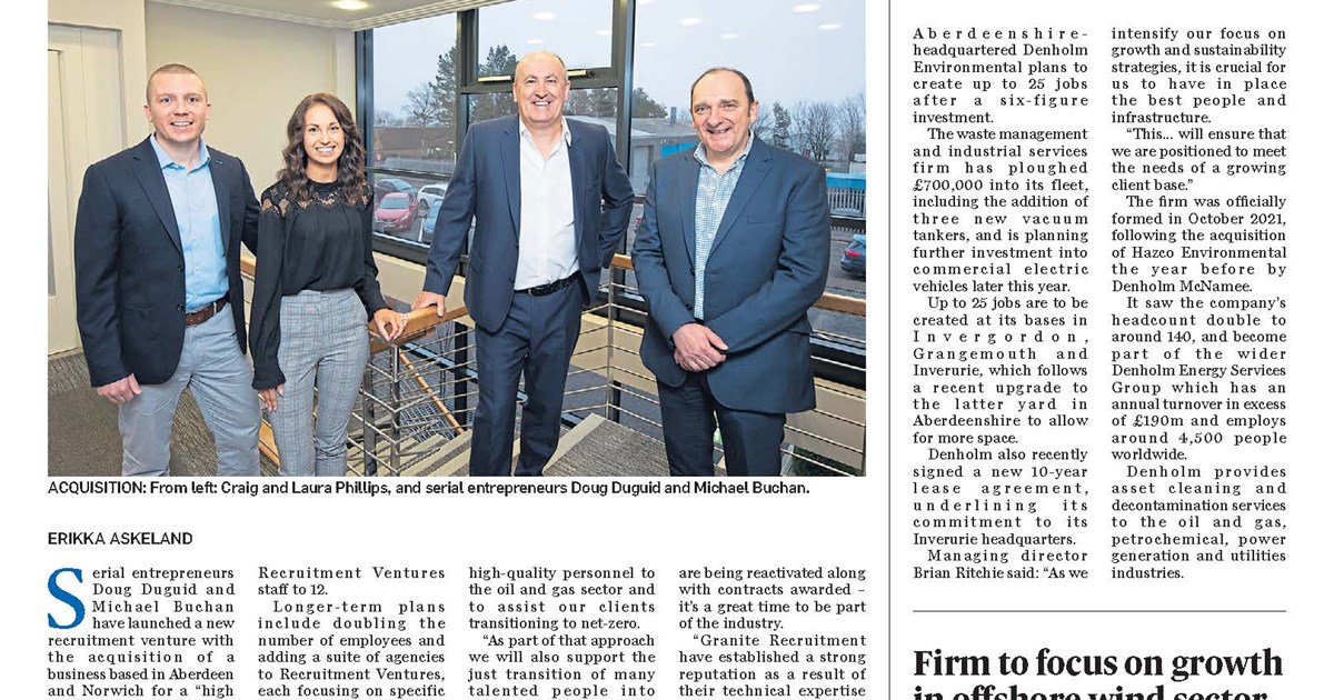 Granite, which specialises in placing skilled and engineering personnel for the drilling, maintenance, well services, and pipeline and process sectors, will join Recruitment Ventures, an “umbrella” company established by Duguid and Buchan, alongside another portfolio recruitment company, Ingenii.